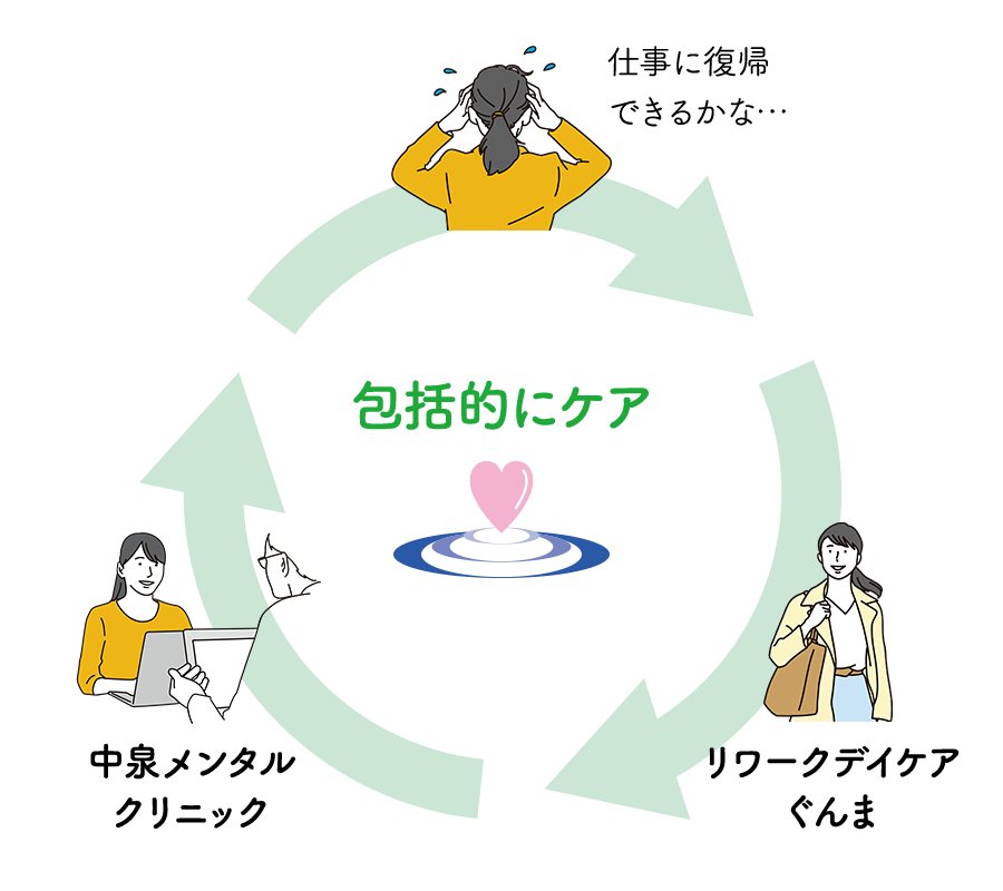 必要に応じて、職場の産業医療スタッフと連携して職場復帰をサポートします。従業員のこころの病気でお困りの企業の皆様も当施設にお気軽にご相談ください。